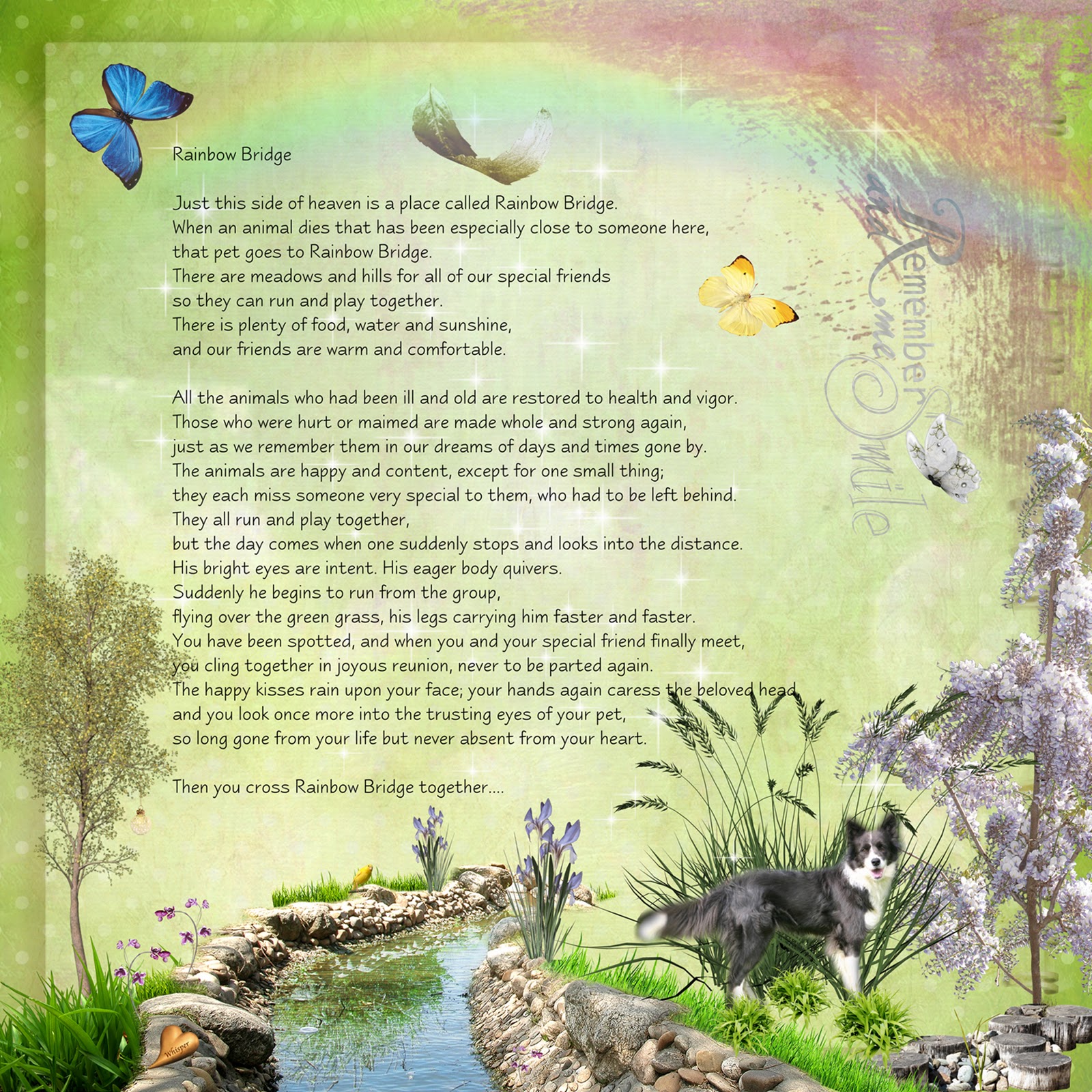 Your pages are both wonderful! I know how hard the Rainbow Bridge page must have been for you to make. It's a wonderful poem... it really helped me when we lost our cat Gus. Whisper was a lucky dog to have you!
